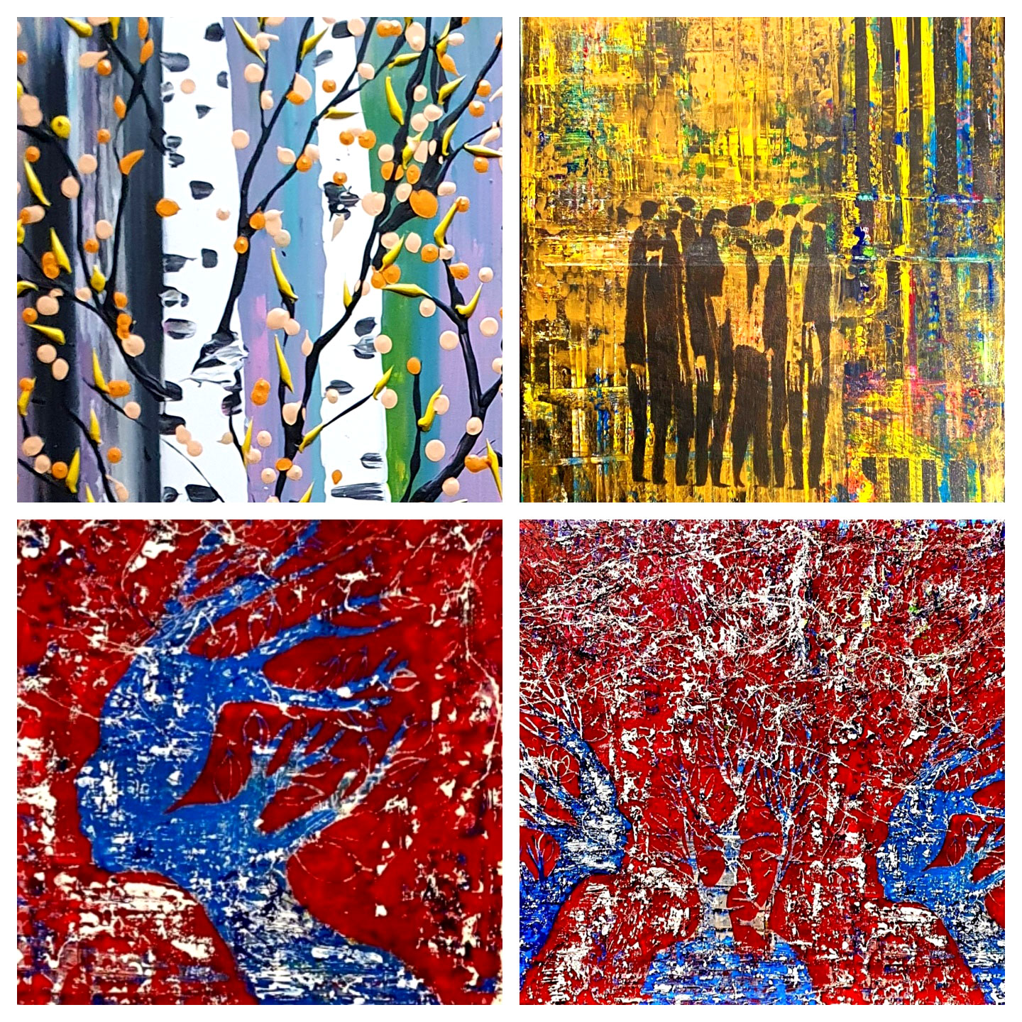 Es werden z.B. Bildvorlagen, Übermalungen mit Wischen „nass in“ Technik, fliesen lassen, Spritztechnik, Tropfen, Stempeln, Schwammtechnik, Schablonier Technik u.v.m. im Kurs angewandt. Auch die Encaustic kommt nicht zu Kurz.